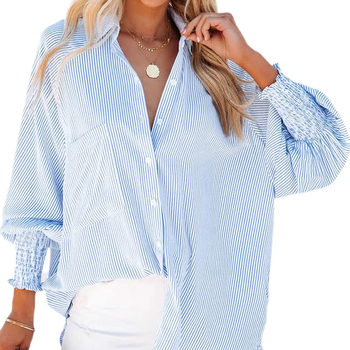 Camisa informal de manga larga con botones de gran tamaño para mujer con pliegues y rayas con bridas, Top estilo novio con bolsillos