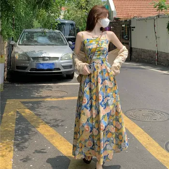 Vacation-Style Floral Camisole Oil Painting-Inspired Dress - Women's Spring Slim-Fit Waist-Defined A-Line Maxi Dress