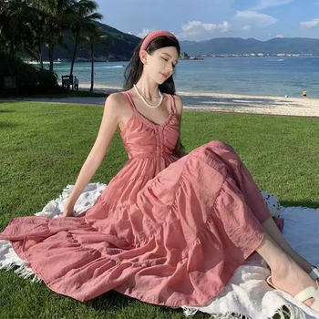 Của phụ nữ Pháp-phong cách thanh lịch màu hồng trượt Dress-mùa hè mềm-phong cách trang bị-eo A-line Maxi Dress